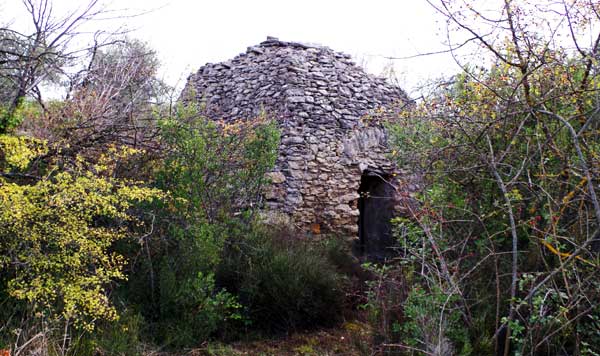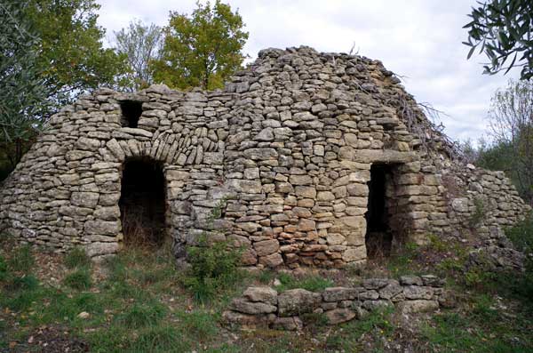 Après 300 mètres environ, vous serez à la hauteur du 1er des 21 bories, sur votre gauche. A l’intersection suivante (une vingtaine de mètres plus loin), tournez à gauche dans un chemin de terre. Tournez encore à gauche pour entrer dans une oliveraie et vous apercevrez sur votre droite le borie n°2. Revenez sur vos pas pour reprendre vers la gauche le sentier qui serpente entre les chênes sur 50 mètres (direction ouest) et tournez à gauche pour suivre un autre sentier plus étroit qui longe un mur en pierres sèches (direction sud) et vous conduit au borie n°3. Revenez sur le chemin et franchissez un petit muret pour prendre à droite un petit sentier sur 15 mètres qui débouche sur un 4ème borie inclus dans un mur en pierres sèches, en ruines mais qui a conservé une entrée intacte.