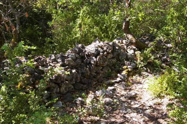 Revenez sur vos pas jusqu’à la clairière, appuyez sur votre gauche pour la traverser. Vous trouvez un chemin mieux tracé qui descend vers le borie n°17. Un peu plus bas, au flanc d’un mur en pierre sèche, on peut voir un « escalier volant » original, permettant l’accès à la parcelle en surplomb. Ne l’empruntez pas mais longez le mur, direction nord, jusqu’au 18ème borie, dans les chênes. Redescendre sur votre gauche, en longeant des parcelles de cerisiers, contournez l'extrémité du mur de pierre (arrondie) et revenez sur vos pas en contrebas de ce mur pour trouver les 19ème et 20ème bories. Longez les cerisiers par la gauche pour rejoindre le chemin carrossable qui surplombe le 21ème et dernier borie.