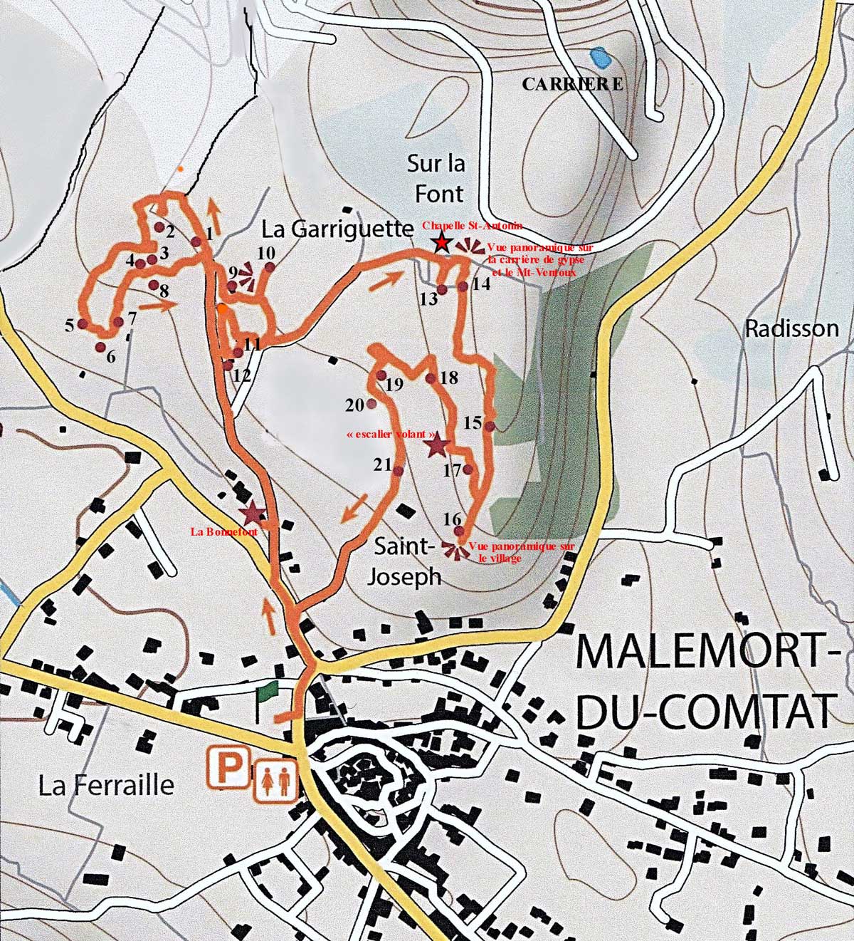 A partir du parking attenant à la Mairie, prendre à gauche et descendre la rue Saint-Jean jusqu’à l’embranchement de la route de Mazan. Prendre la direction de Mazan puis, 150 m après l’intersection, tourner à droite dans le chemin de la Bonnefont qui monte légèrement.